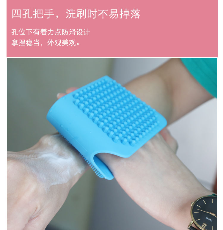 硅膠搓澡刷采用硅膠一體化制作而成,雙面粗細(xì)兩種刷頭設(shè)計(jì),適用不同的清洗方式。四個(gè)指孔牢固固定。防滑設(shè)計(jì)。
