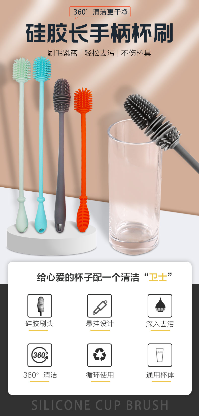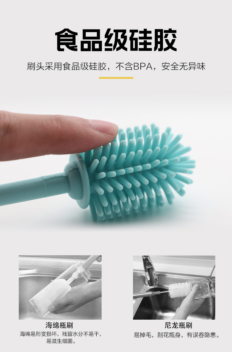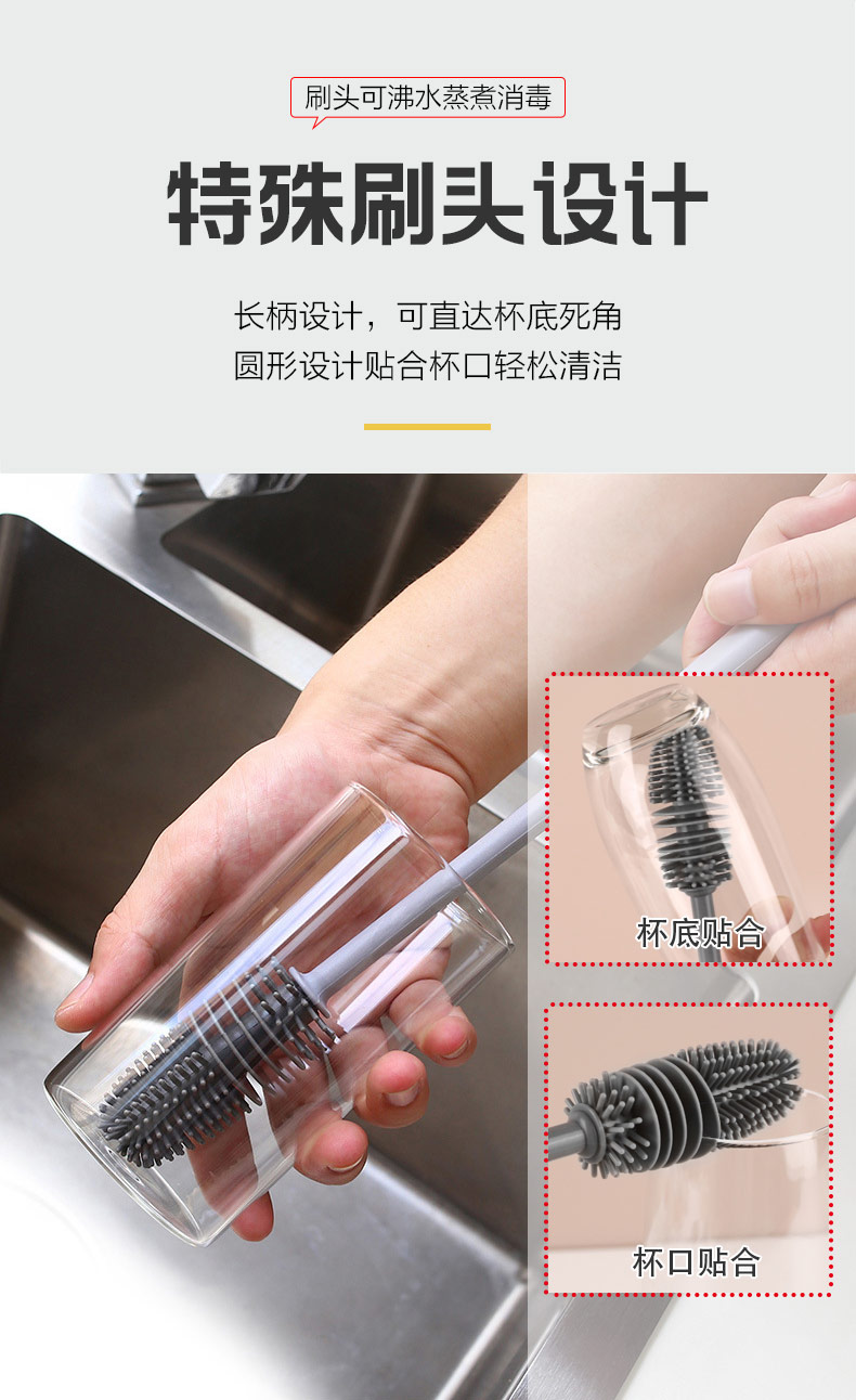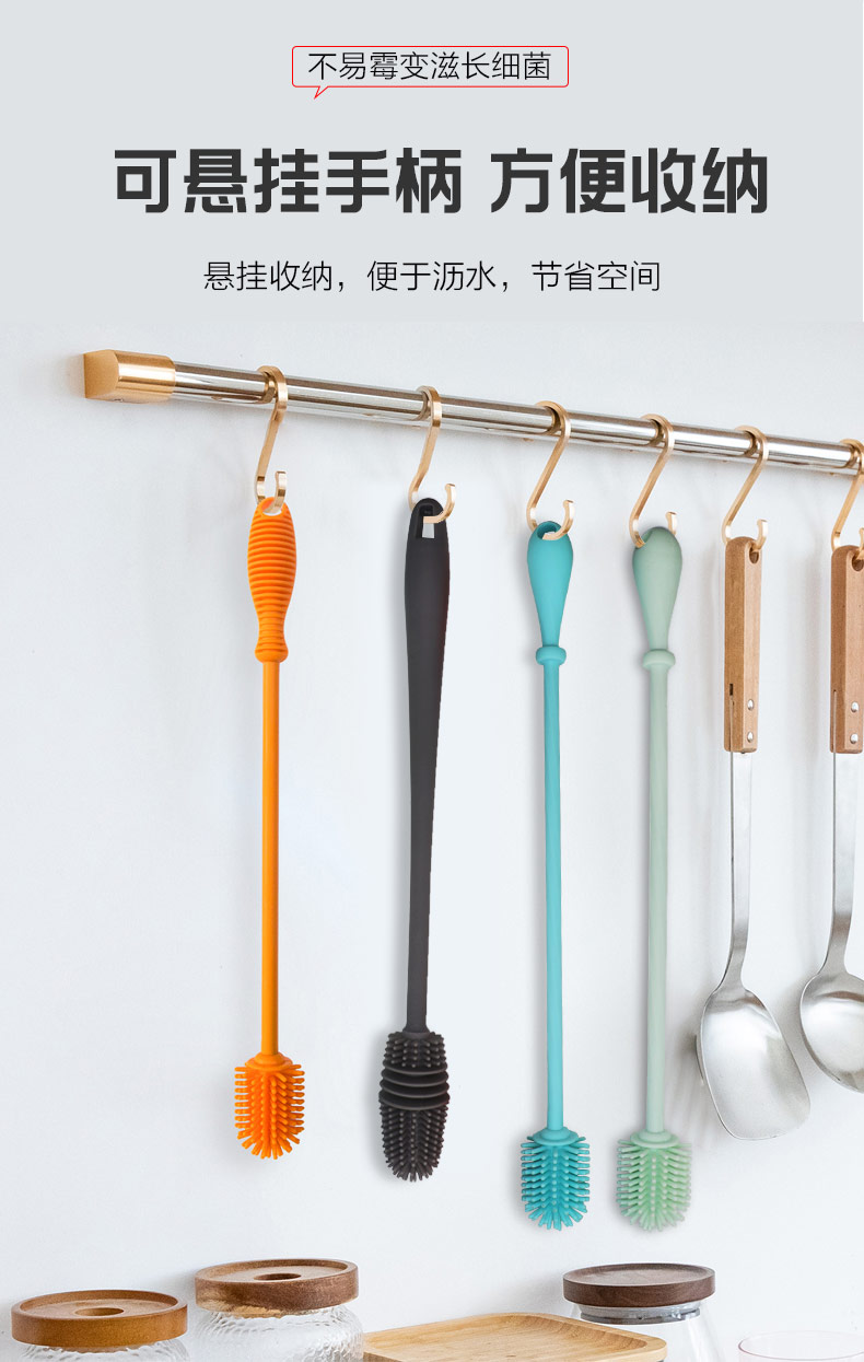 給心愛的杯子配一個(gè)硅膠刷,可以360度清潔水杯內(nèi)壁,刷頭采用食品級(jí)硅膠,不含BPA,無異味,相比海綿瓶刷不容易變形,不容易殘留水分滋生細(xì)菌。適合各類杯子的清潔??铺├鳛橐患夜枘z制品OEM廠家,有能力也有條件定制可彎頭的硅膠刷,人性化的設(shè)計(jì),易懸掛便利瀝水,節(jié)約空間。