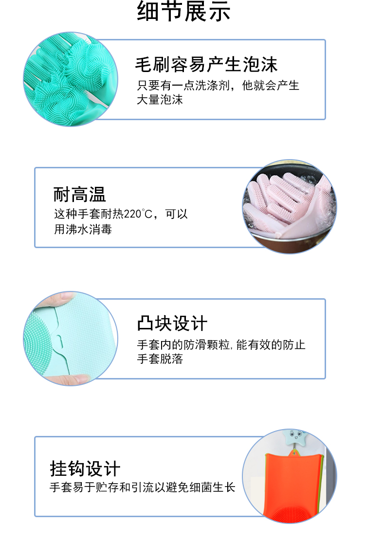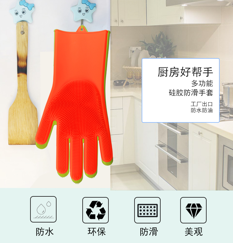 硅膠清潔手套是近年來(lái)比較火熱的廚房清潔用品。采用柔軟硅膠健康材質(zhì),手套正面有多重清潔刷頭,耐磨耐熱,強(qiáng)力去除污漬。