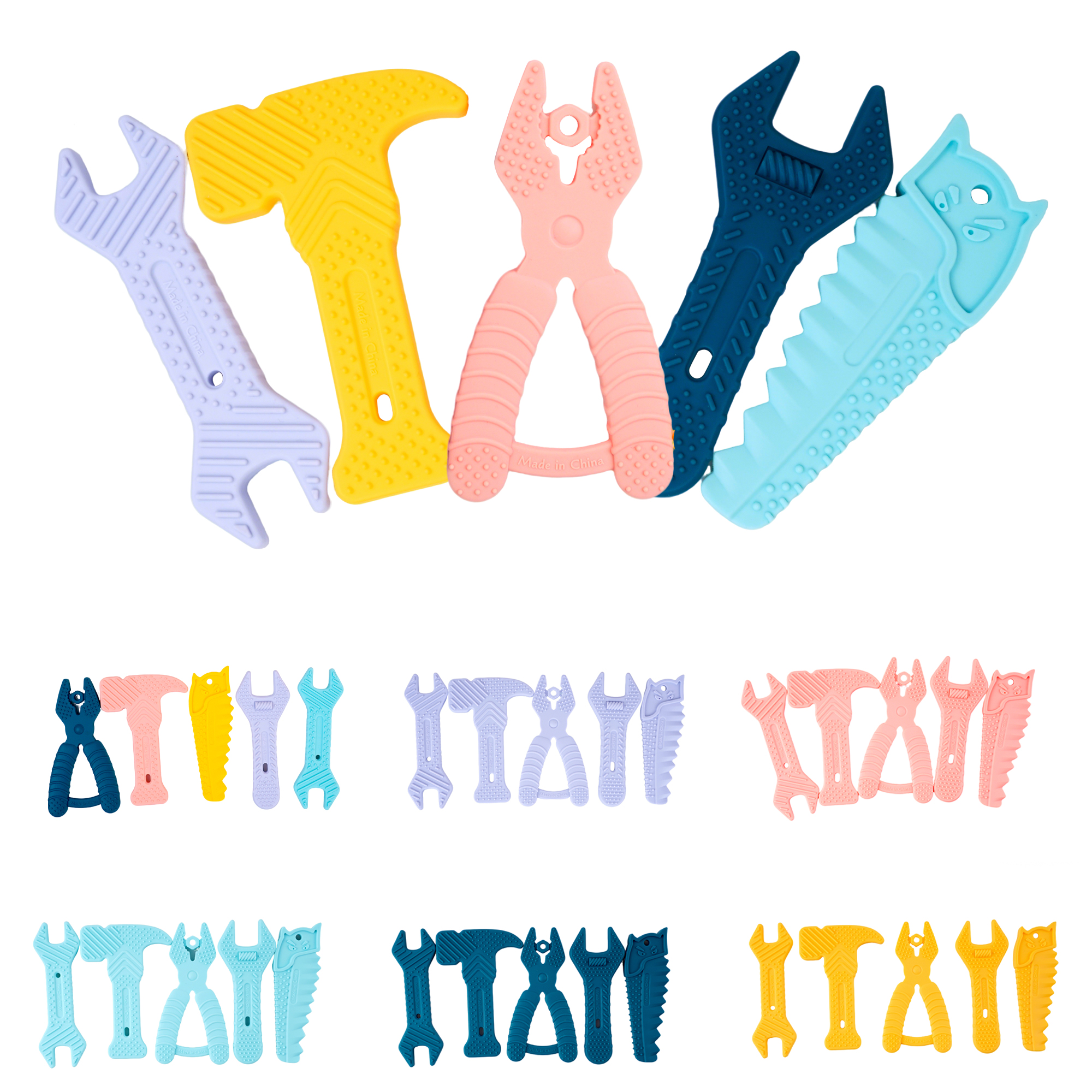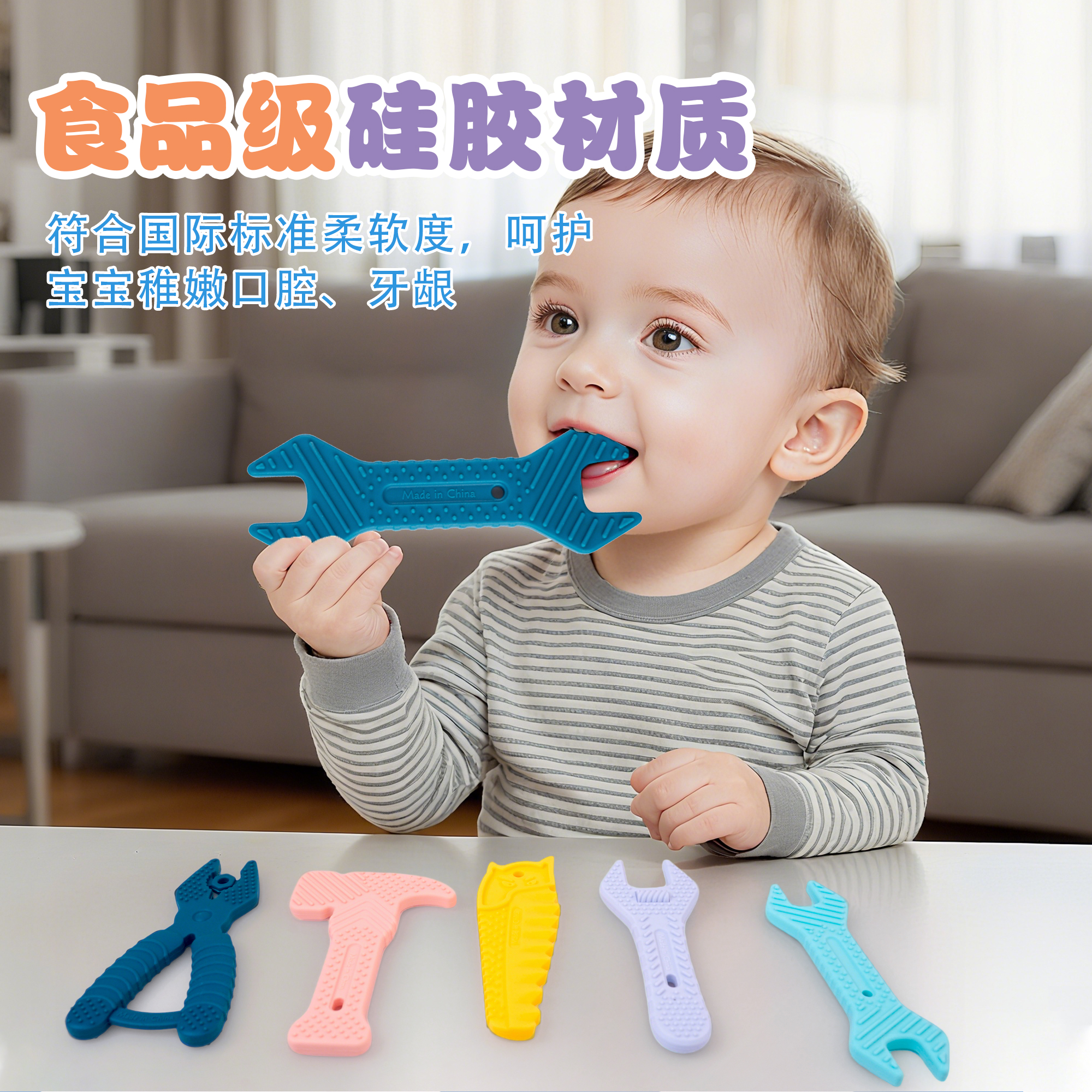 亞馬遜錘子扳手牙膠嬰兒硅膠磨牙棒寶寶卡通兒童防咬手牙膠5件套